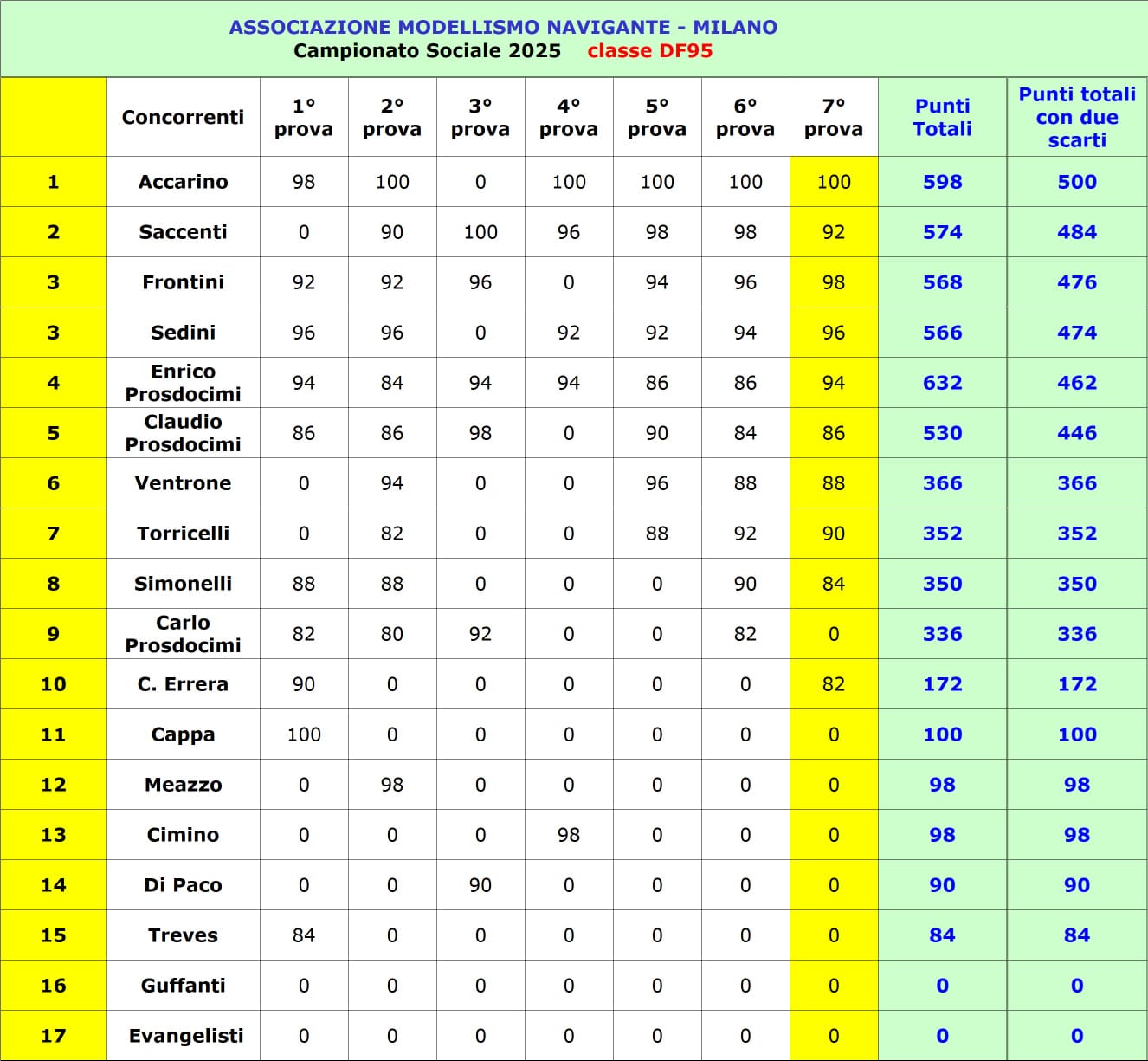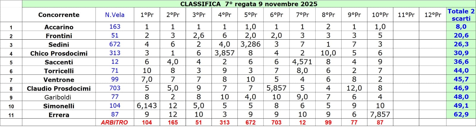 Gli scarti saranno : 1 scarto fino a 7 regate; 2 scarti dalla 8a regata in avanti.